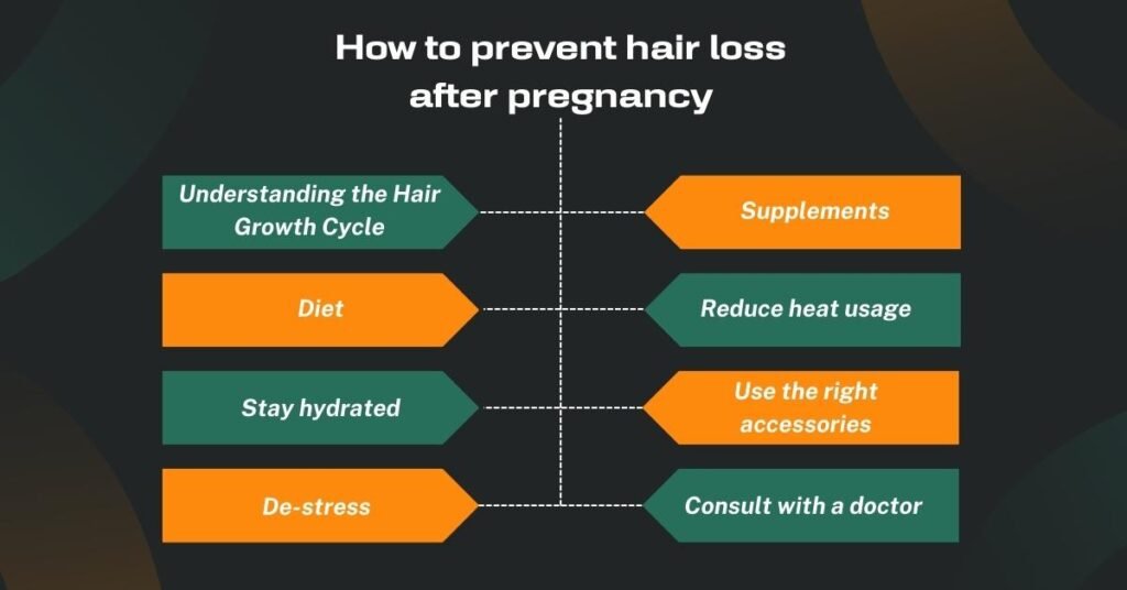 To prevent hair loss after pregnancy, it is important to have a well-balanced and nutritious diet along with plenty of water throughout the day.